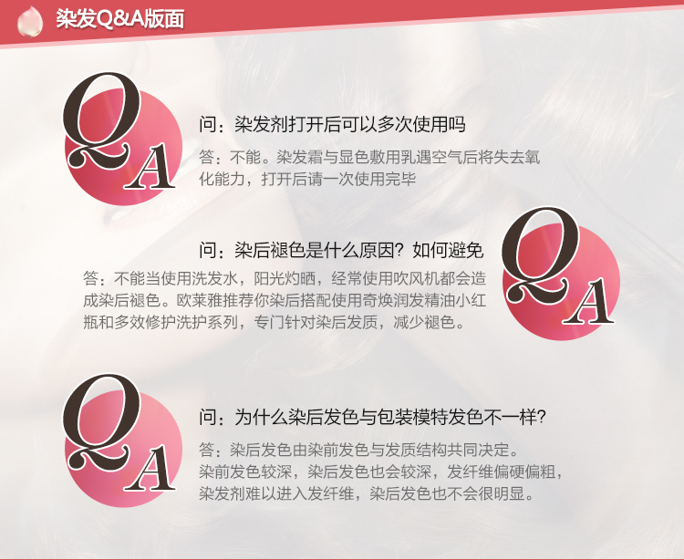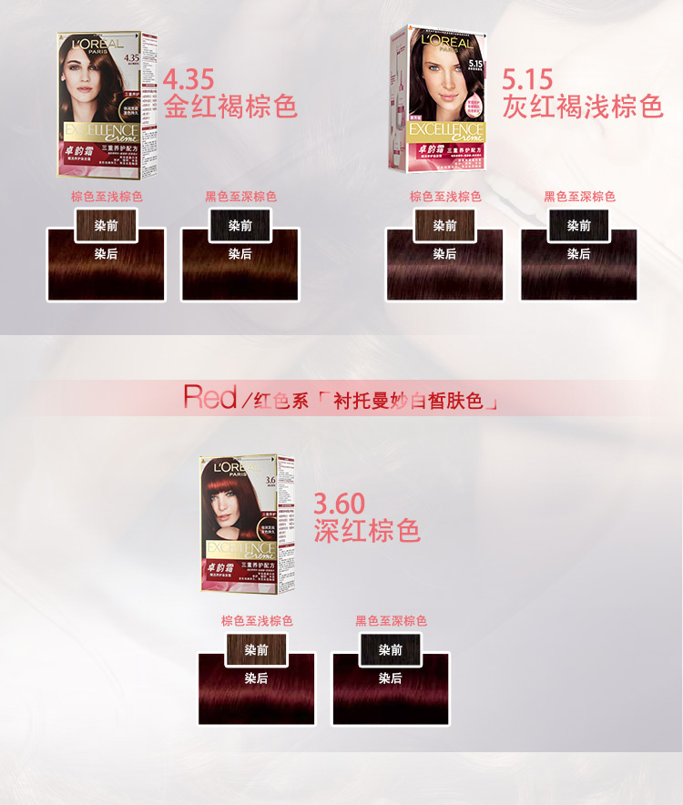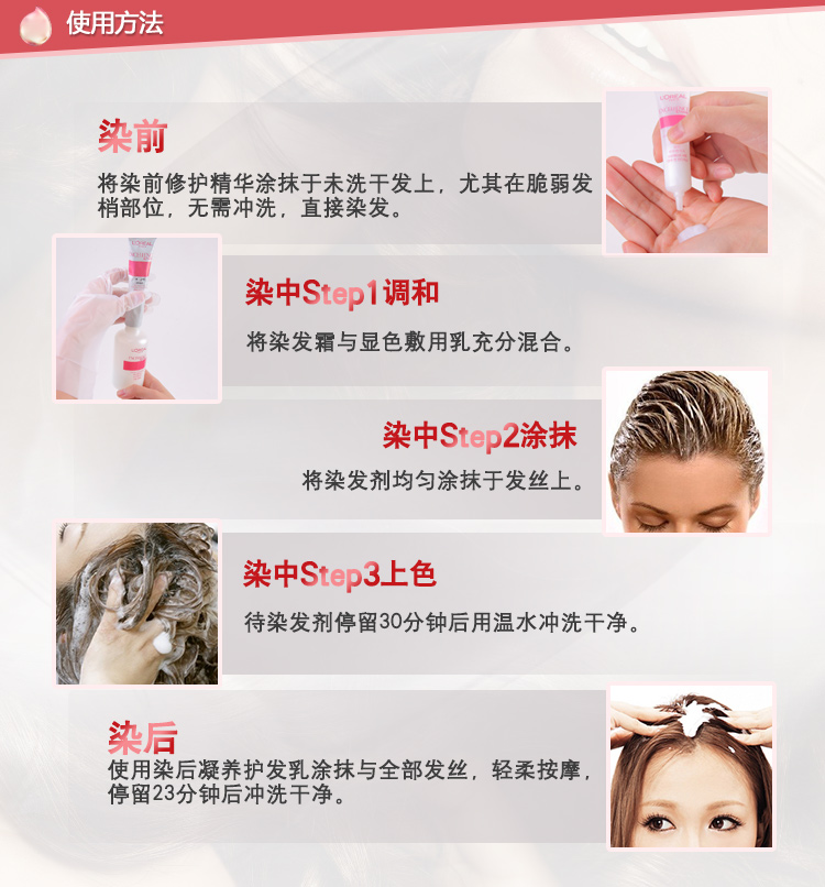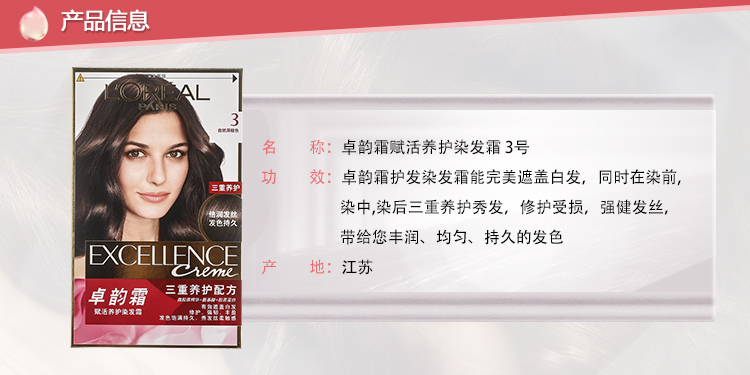 产品功能 Product Function 三重养护配方,三倍饱满发色。完美遮盖白发,同时在染前、染中、染后三重养护秀发、带给您丰润、均匀、持久的发色,秀发更显年轻活力。 产品展示 Products Exhibition![]()